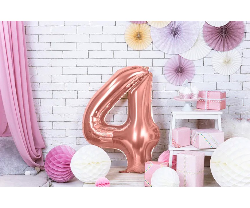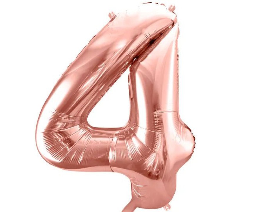 Nav piemērots bērniem līdz 3 gadu vecumam. Neuzpūsti vai pārsprāguši baloni nedrīkst atrasties bērniem (līdz 8 gadu vecumam) pieejamā vietā, iekļūstot elpceļos, tie var izraisīt nosmakšanu.Folijas balons 86cm XL - cipars 4, rozā zelts